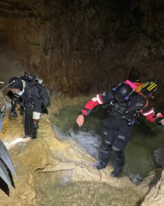 Nous y trouvons une eau limpide dans une jolie galerie aux dimensions très confortables. Biens que l’on puisse passer de s1 à s2 sans sortir de l’eau nous faisons surface dans une petite salle glaiseuse qui marque le frontière entre des deux siphons avant de reprendre la plongée. Il deviendra rapidement évident que ce n’était peut-être pas l’itinéraire le plus judicieux. Notre visite du s2 est écourtée lorsque nous trouvons le fil d’ariane cassé. Après quelques minutes de recherche, aucun signe de l’autre bout du fil. Nous ne somment pas vraiment dans les meilleures conditions pour rééquiper et faisons demi-tour. Lorsque nous retrouvons le S1, la visibilité se dégrade soudainement à moins de 1m. Tout le monde éprouve soudainement le besoin de mettre la main sur le fil guide, avec la ferme intention de ne pas le lâcher. C’est ici que l’erreur de parcours devient évidente, la glaise soulevée par notre sortie entre s1 et s2 est en train de retomber dans la galerie. Heureusement cela ne sure que quelques mètres. Tout le monde se rappel à présent pourquoi il vaut mieux visiter le cloches et galléries annexes au retour et non à l’allée.
